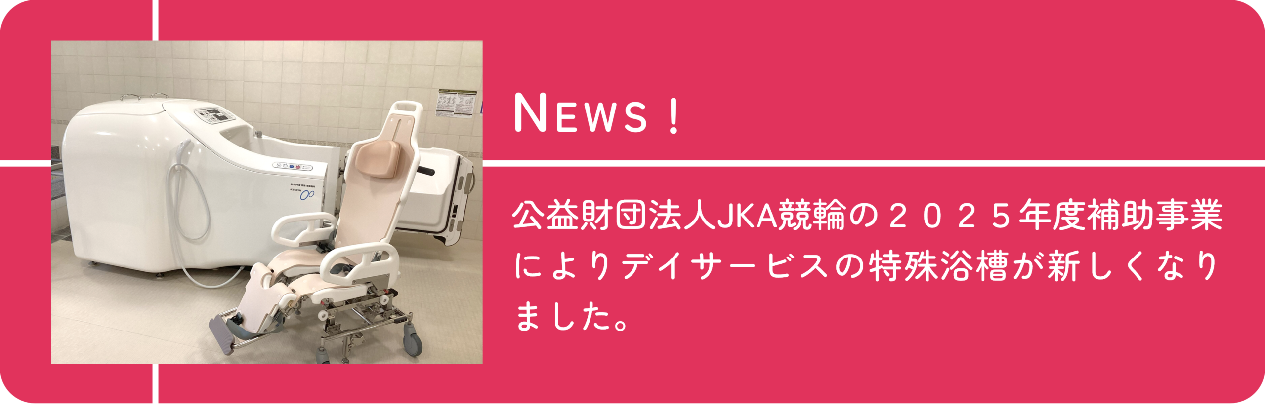 - 新しい特殊浴槽公益財団法人JKA(競輪とオートレース)様の補助金により、特殊浴槽が新しくなりました。 特殊浴槽とは、足が悪い… 続きを読む: 新しい特殊浴槽
