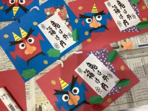 節分飾りの製作をしました。 パーツは全部準備してあるので、台紙に貼るだけです😊 見本を見ながら黙々と貼っていき… いろんな表情の鬼が出来上がりました。