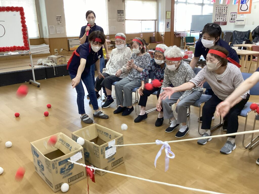 職員が引っ張る箱に玉を投げ入れていきます。