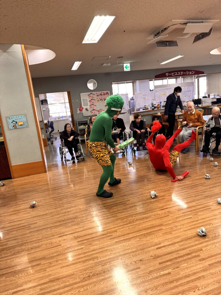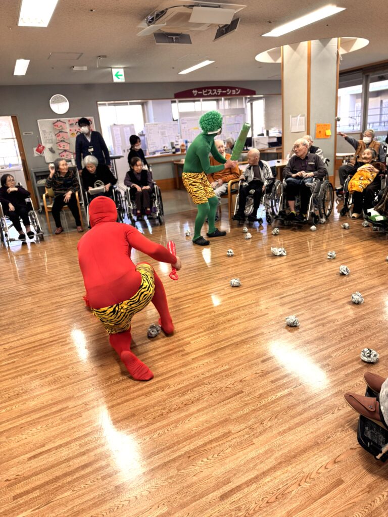 職員扮する鬼に向かって、「鬼は外、福は内!」と元気な掛け声が響き、