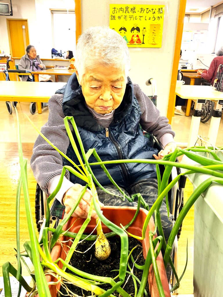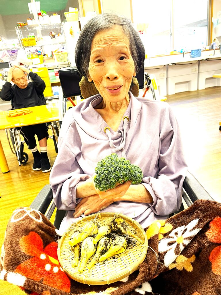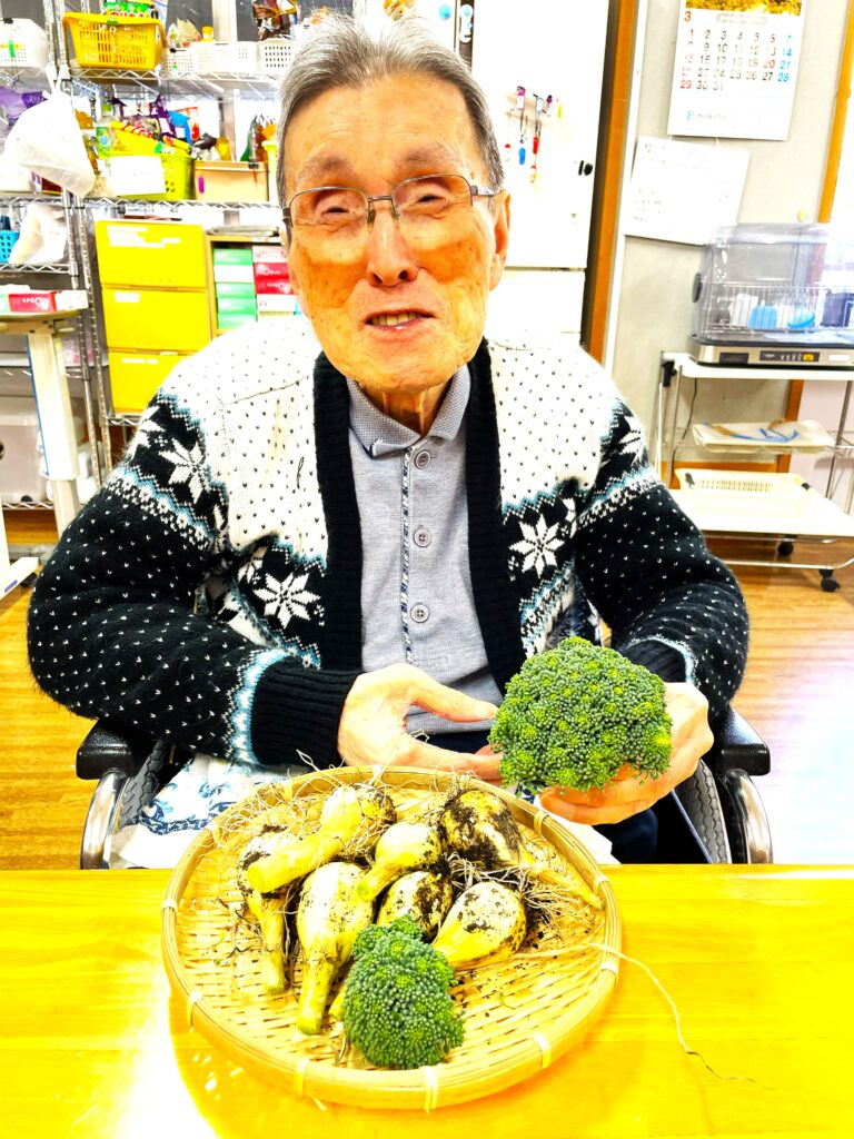 施設のプランターで育てていたブロッコリーと玉ねぎを、利用者様と一緒に収穫しました。