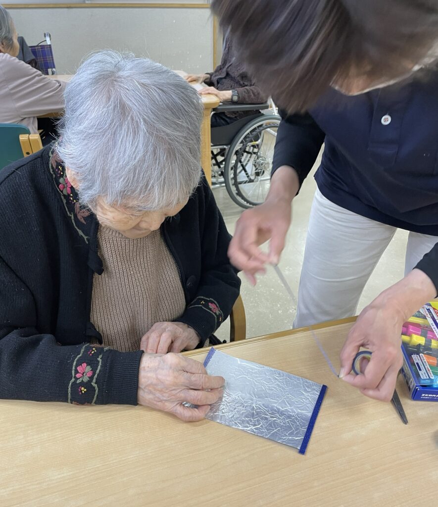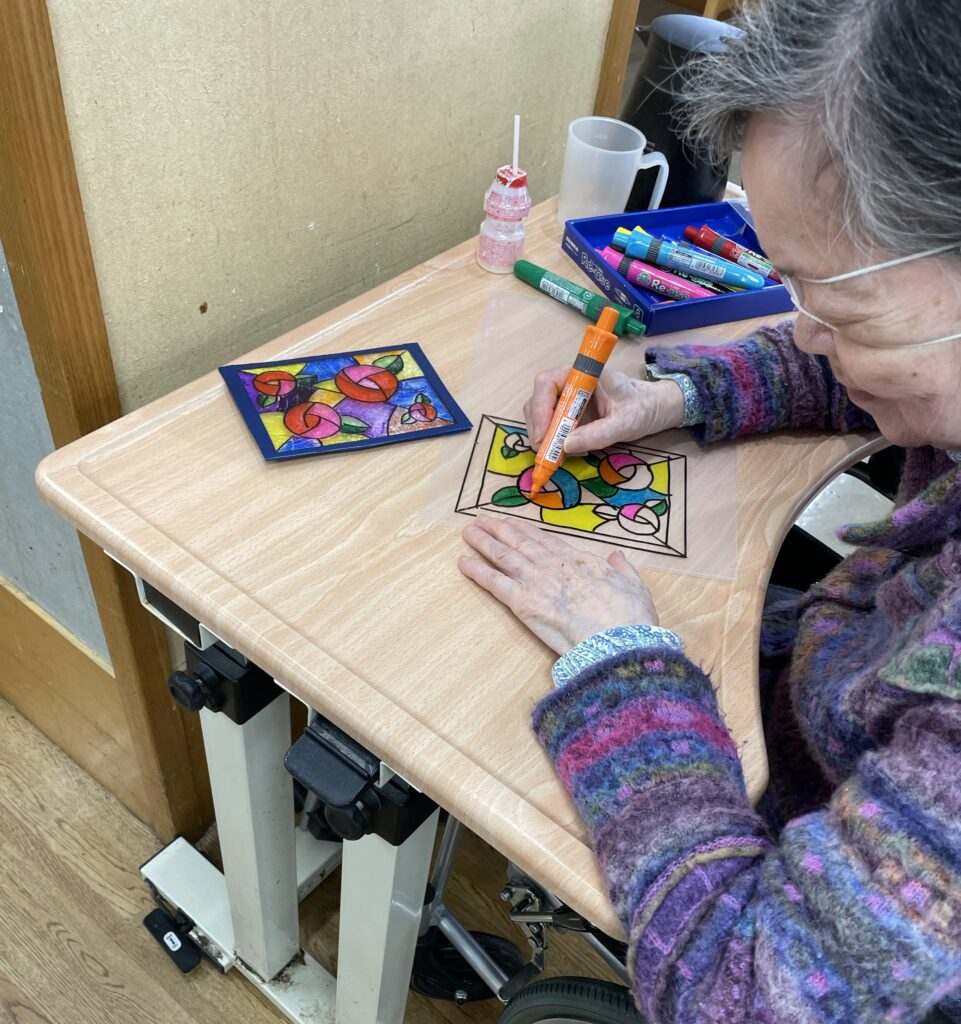 ✨ステンドグラス✨ 2026年4月24日 最終更新日時 : 2026年4月24日 aikou 今日は特養の製作の様子をお届けしま~す🤗 アルミホイルを台紙に貼って、、🤓 マジックで色塗りすると、、🎨🖌 素敵なステンドグラス風の作品が出来上がりました~🥰 とってもきれいです🎶 ご面会の際に、ぜひご覧下さい😊